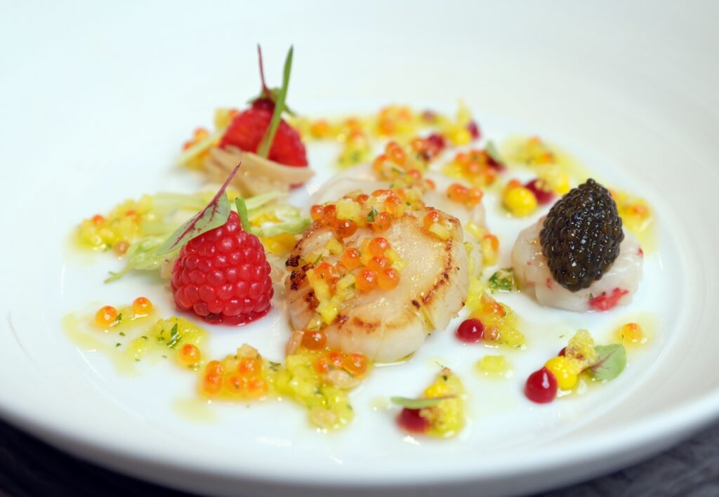 Im Mittelpunkt stehen dabei hochwertige Zutaten und ein feines Gespür für Aromen. So wird etwa auf Molkereiprodukte in Cremes und Pürees verzichtet, Industriezucker reduziert – zugunsten von Klarheit, Frische und Balance. Das Menü ist bewusst saisonal geprägt, handwerklich anspruchsvoll und detailverliebt. Jedes Gericht ist ein kleines Kunstwerk.