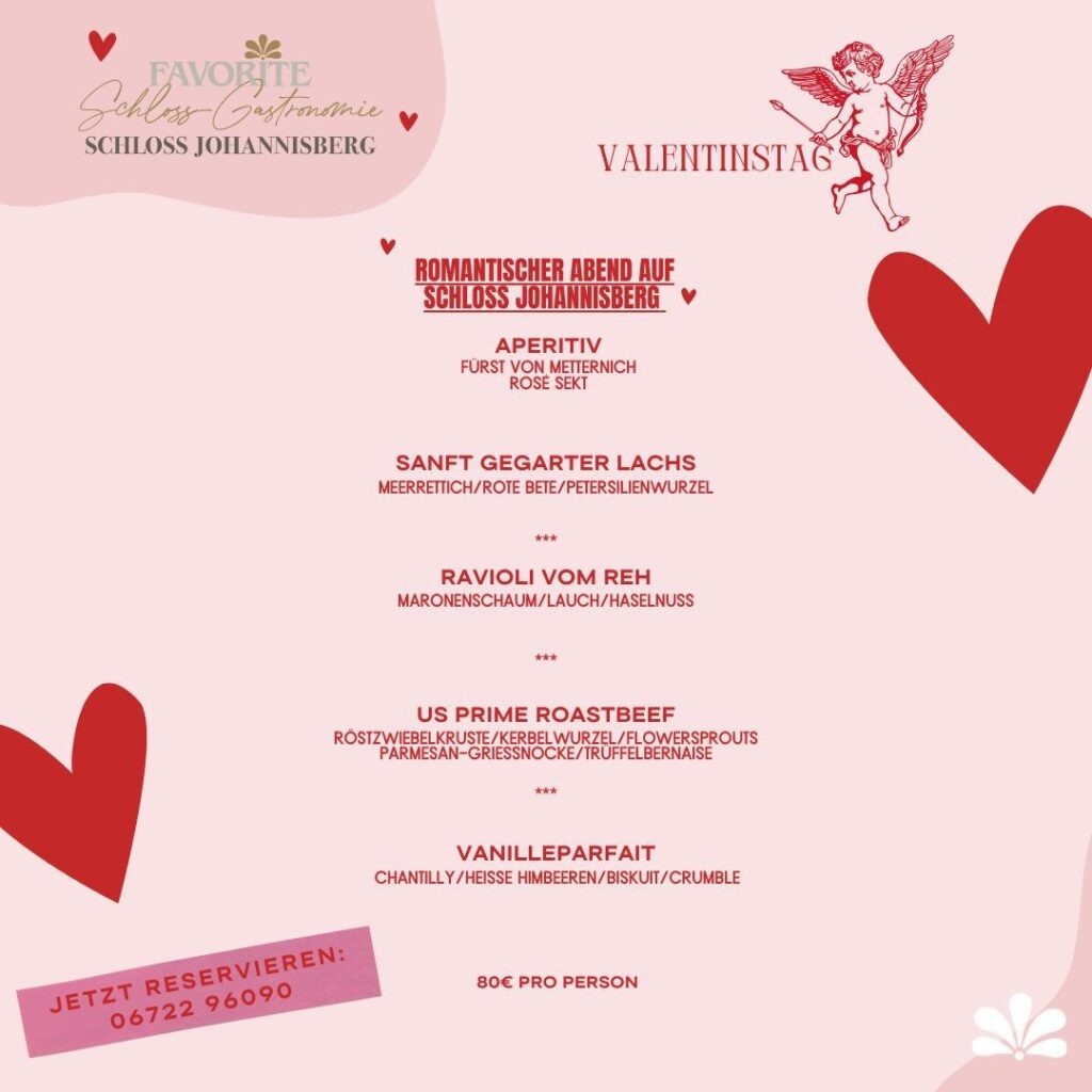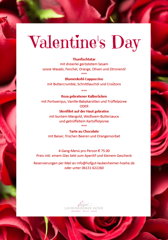 Feiern Sie den Valentinstag in besonderer Atmosphäre, auf Schloss Johannisberg, dem Hofgut Laubenheimer Höhe oder in unserer Favorite Weinbar. Genießen Sie ein romantisches 4-Gänge-Valentinstags-Dinner das mit einem Glas Sekt zum Auftakt beginnt.